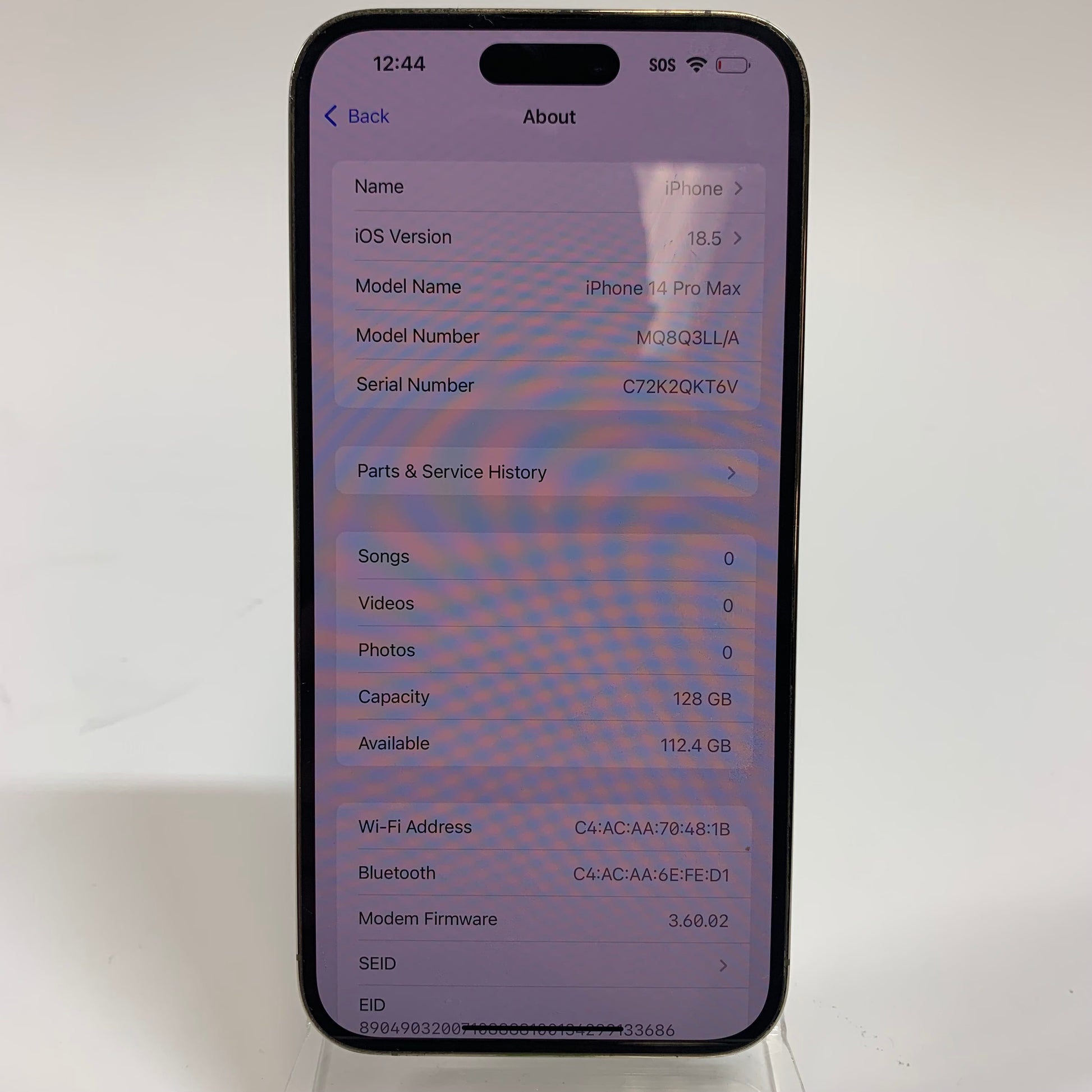 The power button, vibrate/ringer switch and volume buttons are all fully functional with no issues. Both the front and rear cameras are fully functional with no issues. The Face ID functions properly and is ready to be set up. The LCD/OLED has no issues or damage. The Digitizer (Touch Screen) responds to touch and is fully functional. The WiFi abilities are available and fully functional. The Bluetooth abilities are available and fully functional. All speakers function properly and sound great. The battery needs to be serviced. This means that the battery needs to be replaced. The phone charges and powers on in order for me to test all functions, but the battery will die sooner rather than later. The True Tone function is available and working properly. This iPhone has a clean IMEI and is ready to be activated! The charge port is clean and fully functional.